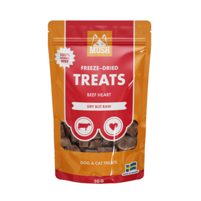 MUSH TREATS NÖTHJÄRTA är ett frystorkat kompletteringsfoder för hundar och katter, använd endast som djurmat. Se till att alltid ha färskt vatten tillgängligt. Tvätta händerna och rengör ytor som har varit i kontakt med produkten. Förvara i rumstemperatur.